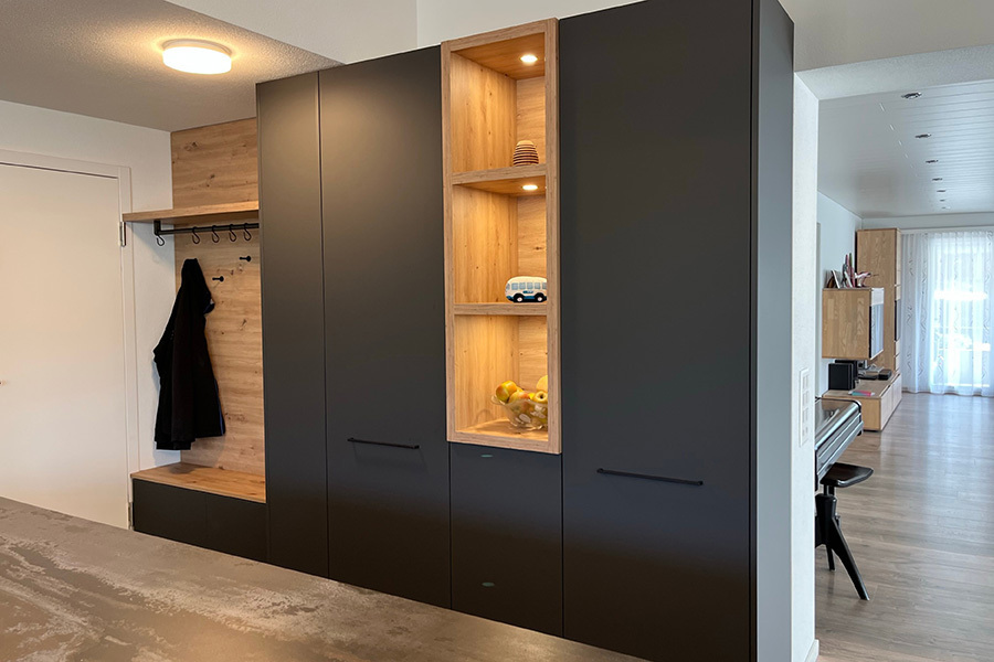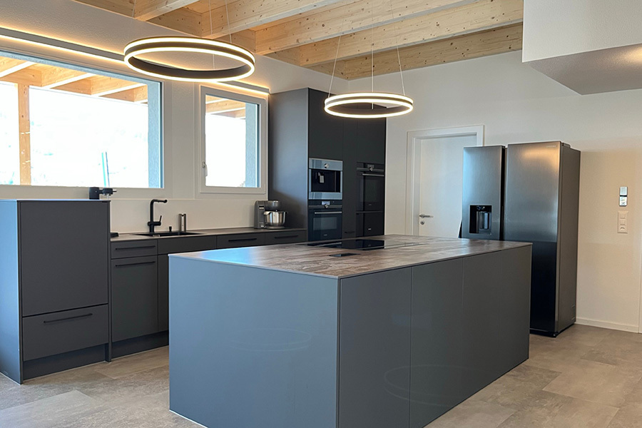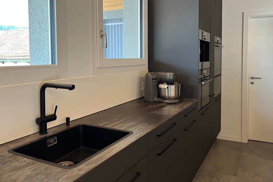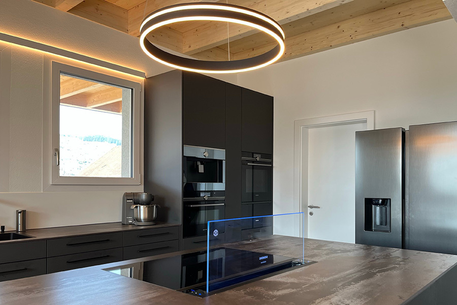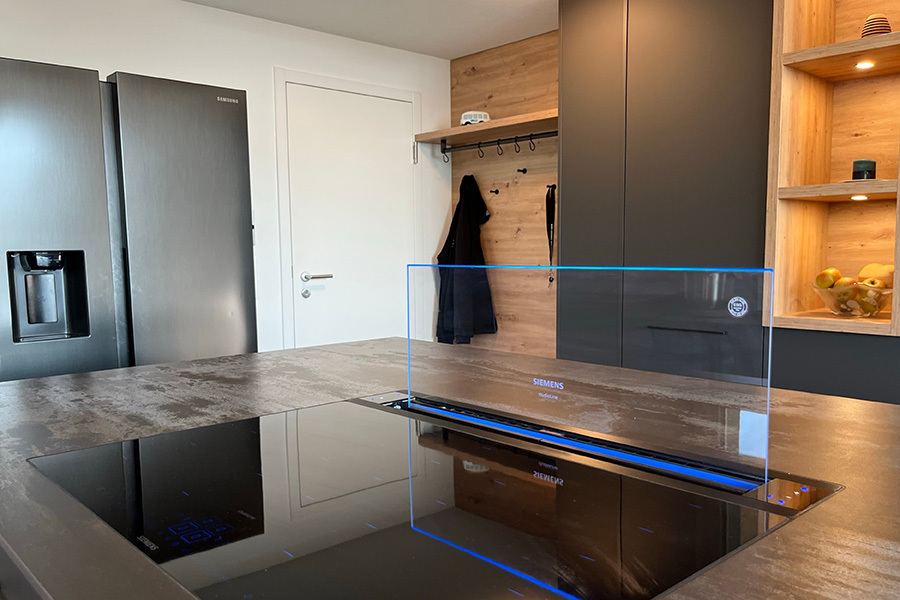 Diese Küche besticht durch Besonderheiten: Die moderne Absaughaube ist ein stylisher Blickfang, die Steckdosen wurden direkt in der Arbeitsplatte eingebaut und aufgrund der Platzverhältnisse ist die Garderobe in das Design der Küche integriert.