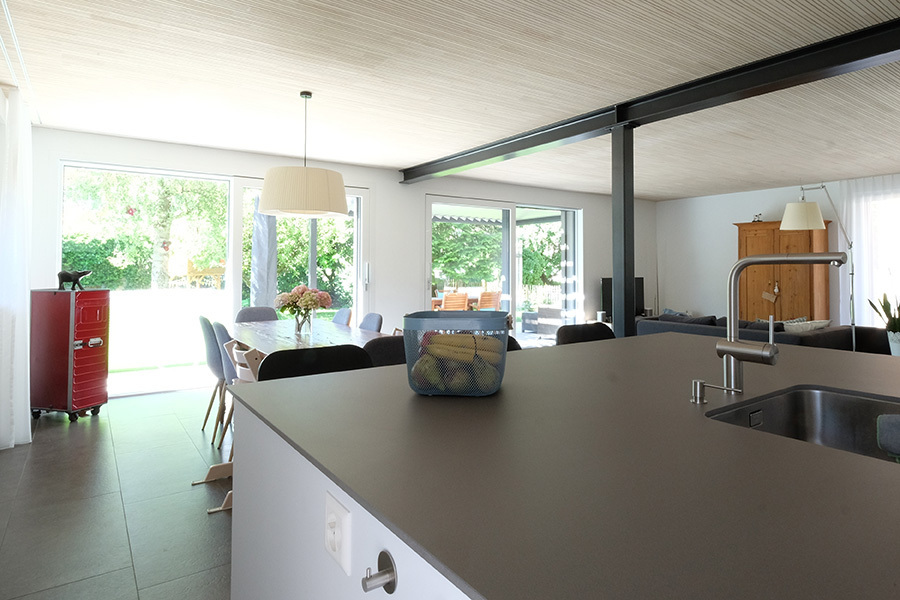 Dieses Klimaholzhaus wurde mit passenden Kunststoff-Aluminium-Fenster ausgestattet. Die Hebeschiebetüren sind sehr praktisch und die schrägen Fenster im Dachgeschoss bieten den Kindern genügend Lichteinfall zum Spielen.