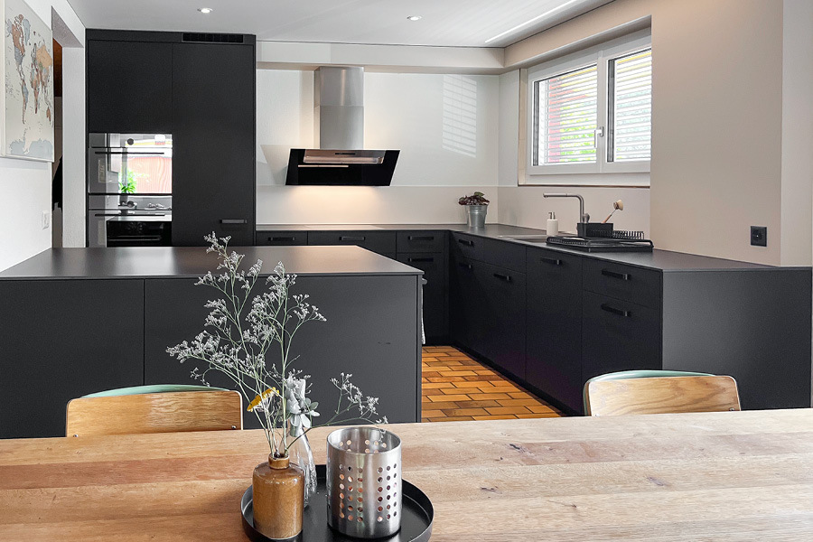 Im Mittelpunkt dieser stilvollen Küche steht der bestehende Klinkerboden. Durch das dezente Schwarz der Küche wird dieser gezielt in Szene gesetzt. Sandbeige Decken- und Rohrverkleidungen runden das Gesamtbild harmonisch ab.
