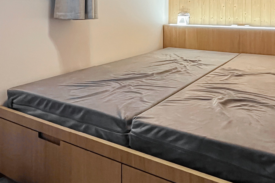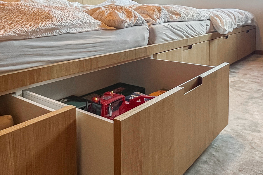 Bei diesem Massenlager wurden unter den Bettgestellen praktische Schubladen integriert, die für grosszügigen Stauraum sorgen. Das integrierte LED-Band im Kopfteil schafft stimmungsvolle Wohlfühlmomente.