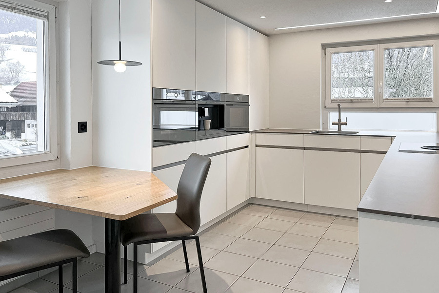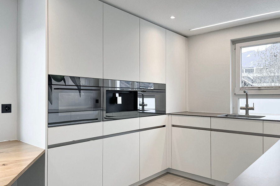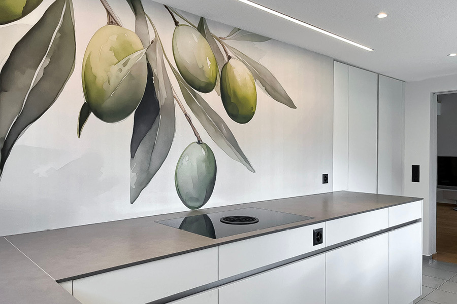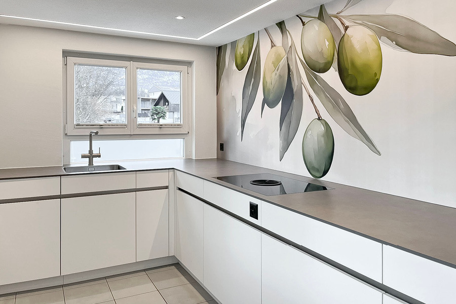 Viel Stauraum, dezente Griffmulden und ein ergonomischer Arbeitsablauf prägen diese Wohlfühloase. Das Oliven-Wandbild verleiht der Küche einen frischen Farbtupfer und macht das Kochen gleich noch freudvoller.